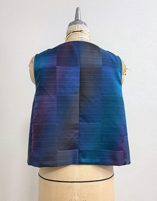 青系ベストはファッションのアクセントに。着物を仕立てられた残りの生地をご持参されました。格子柄でグラデーションカラーというデザイン性のある生地が印象的です。「ベストにしてほしい。アクセントとしてポケットをつけてほしい。デザインは任せます」シンプルな形のベストに、アクセントとしてデザインポケットを右側に取り付けました。すっぽりと頭から被ることができる形は着やすさを重視し、デザイン性のある生地を活かしています。