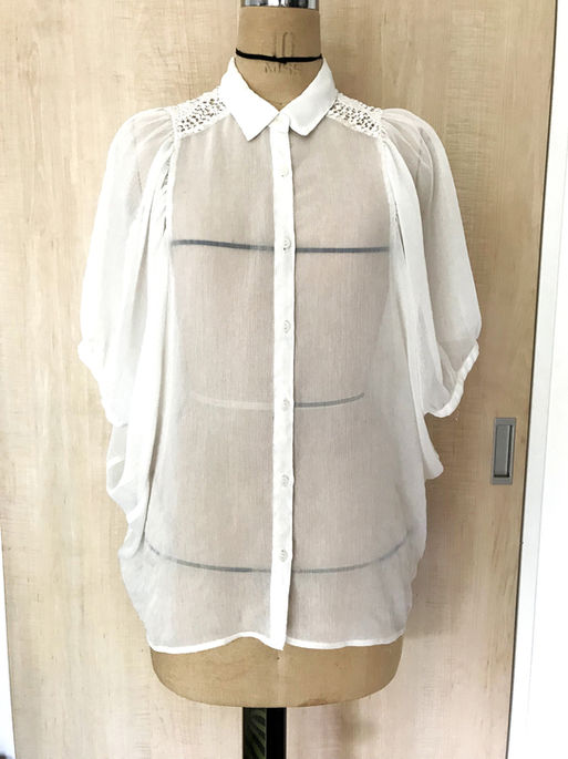 涼しげな透け感のあるブラウス。襟の後ろに綿レースをあしらっています。インナーに着るタンクトップやキャミソールでオシャレを楽しめそうですね。