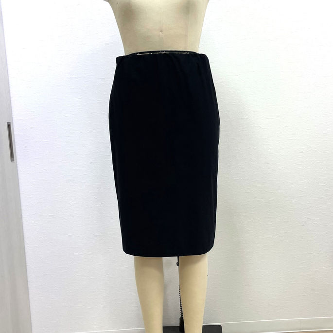 電話でご注文いただきました。「この間、創ってもらった白のタイトスカート、履きやすいし、しわにならないし、ラク! すっごく良いわ!だから、全く同じ形で、生地も色違いのもので、もう1着創ってほしい」とのことでした。色は着回しのきく黒にすることに。前にお創りしてから、1か月も経たない時期だったので、仮縫い等の必要はありません。白スカートの型紙をそのまま使い、制作しています。